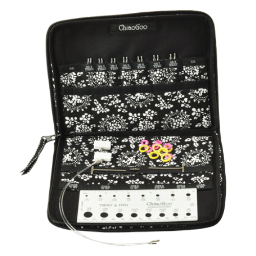 Sets come in either 4 or 5″ (10 cm and 13cm) sizes, bamboo tips and three clear, nylon cables. SPIN nylon cables allow the tips to swivel freely. Also included with each set are easy-to-read, coded cable connectors, end stoppers, T-shaped tightening keys, stitch markers, a needle gauge and compact, zipper-enclosed, fabric case. SPIN & TWIST tips, cables and accessories are all switchable!